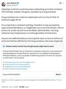 As the legal proceedings against Maduro unfold, the debate over Witkoff’s post continues to highlight the complex interplay between domestic public health crises and international law enforcement efforts.