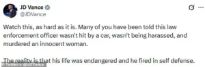 Vance, who shared the clip on X, emphasized that the media’s portrayal of Ross as a ‘ruthless killer’ is misleading. ‘The reality is that his life was endangered and he fired in self-defense,’ he wrote, challenging the narrative that Ross was unprovoked or at fault.