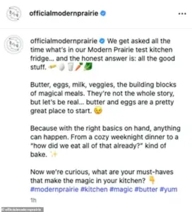 Gilbert’s lifestyle brand, Modern Prairie, shared images of the fridge packed with butter, eggs and other staples, prompting criticism from followers