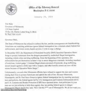 She also demanded access to Minnesota’s voter rolls to ensure compliance with federal law. ‘I am confident that these simple steps will help bring back law and order to Minnesota and improve the lives of Americans,’ Bondi stated, framing her demands as a necessary measure to restore stability.