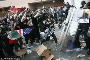 One of the demonstrators, 19-year-old Yamilet Segundo, told the Los Angeles Times, ‘I told my friends we should come out after school to use our voice, but I wasn’t expecting to see this.’ Segundo, who described the scene as ‘really sad’ and ‘getting violent,’ said she was nervous about the escalating tension. ‘It’s honestly really sad to see that it reached this point,’ she added, her voice trembling as she recounted the chaos unfolding around her.